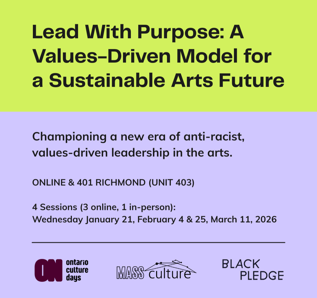 Lead with Purpose: A Values-Driven Model for a Sustainable Arts Future is a small-group professional development series designed for arts organizations committed to embedding anti-racist, community-centered, and values-driven leadership into their operations. Hosted by Ontario Culture Days, Mass Culture, and The Black Pledge Collective, and grounded in CPAMO POC’s facilitation practices, the program brings topics such as community engagement, leadership, and conflict resolution into timely learning opportunities informed by the lived experiences and evolving needs of our networks.